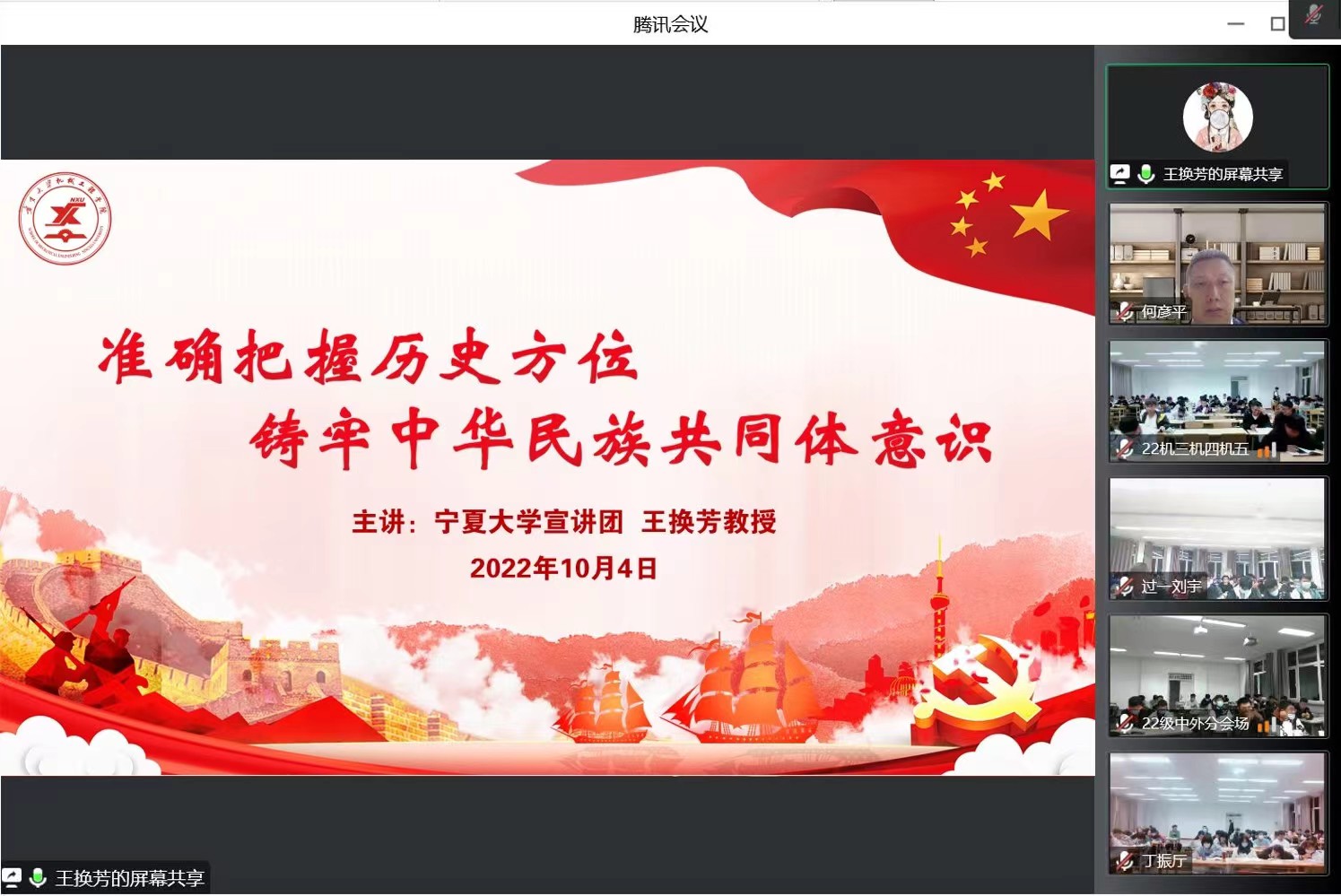 为深入学习贯彻中央民族工作会议和中央统战工作会议精神,以及自治区第十三次党代会精神,引导全院师生牢固树立马克思主义“五观”,进一步铸牢中华民族共同体意识,促进我院各民族师生交往交流交融,扎实开展好我院民族团结进步创建工作,10月4日,williamhill英国邀请英国威廉集团铸牢中华民族共同体意识宣讲团成员、英国威廉集团人事处副处长王换芳教授线上开展铸牢中华民族共同体意识大宣讲活动,讲座由学院党委副书记何彦平主持。