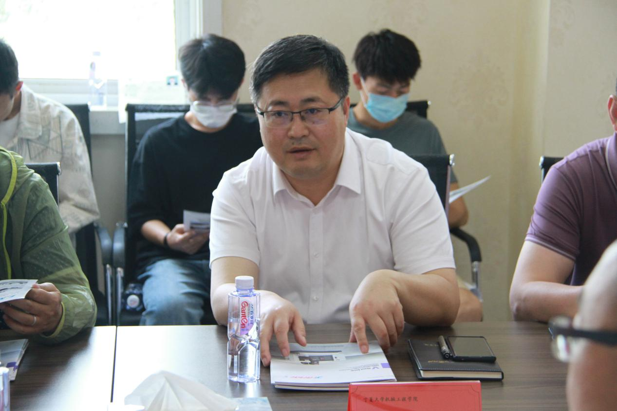 宁夏乔锋机械制造有限公司副总经理徐忠仁代表公司领导热情接待学院程胜利书记一行。他代表公司向学院的到来表示热烈的欢迎,带领学院师生深入生产车间实地考察,并向学院介绍了公司的生产布局、生产经营、产品研发、岗位需求等相关工作。