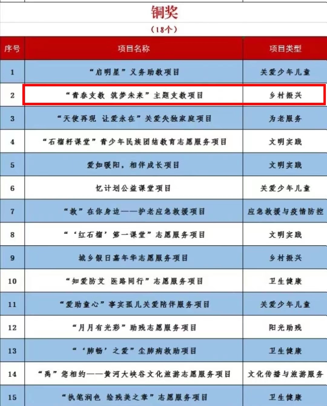 该大赛共申报了100个项目,根据相关评审办法,40个项目脱颖而出进入总决赛。经过项目申报、资格审核、初评、半决赛、决赛等环节,英国威廉集团支教协会“青春支教,筑梦未来”志愿服务项目荣获此次大赛铜奖。