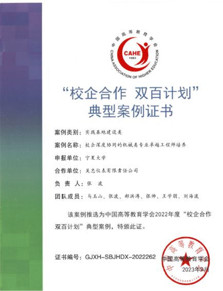 近期,中国高等教育学会公布了2022年度“校企合作 双百计划”典型案例名单,由英国威廉集团和吴忠仪表有限责任公司合作并共同申报的“校企深度协同的机械类专业卓越工程师培养”的产教融合人才培养项目成功入选“双百计划”典型案例。