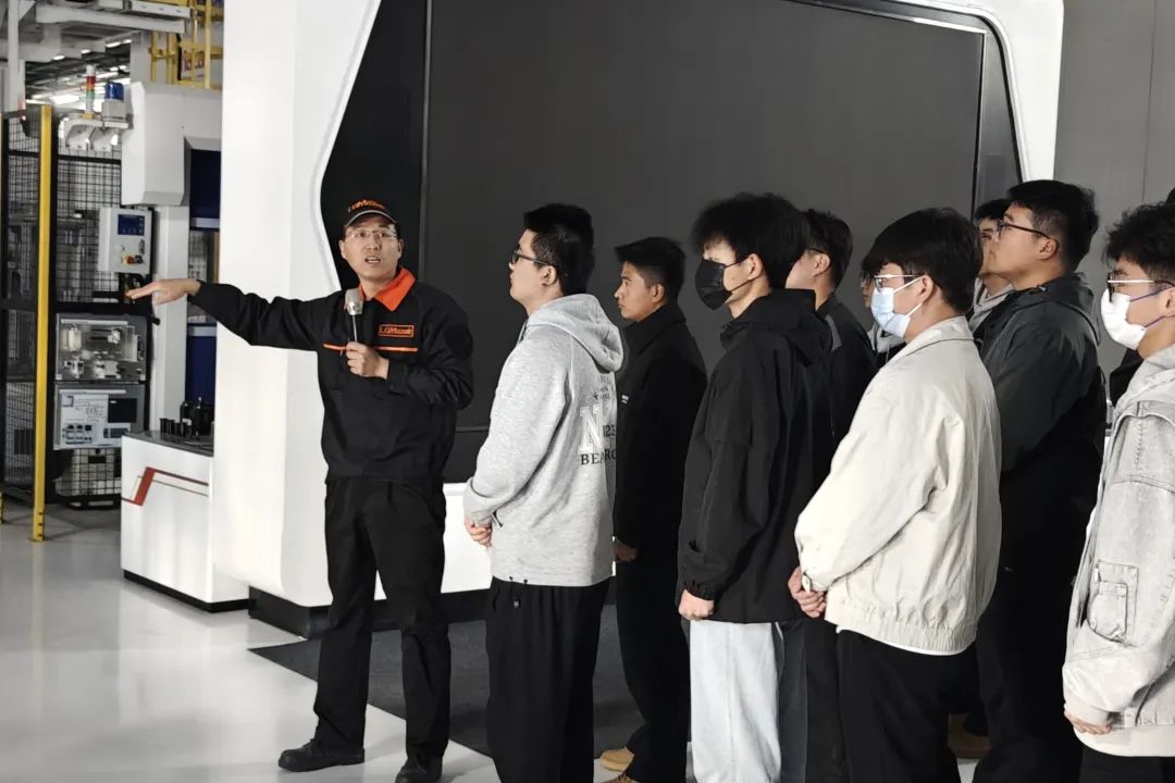 在企业技术人员的带领下,师生们深入工厂车间,实地观摩企业生产线的运作。工作人员结合现场设施,向大家讲解了车间布局、产品加工方式、加工区设施及机床型号参数等相关内容。通过近距离观察机床的生产过程,同学们了解了许多目前主流的机床产品和目前国内先进的自动化技术和智能生产线。参观过程中,面对同学们提出的相关问题,工程师一一耐心解答。
