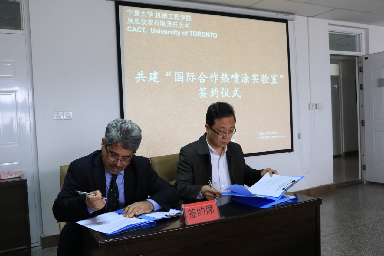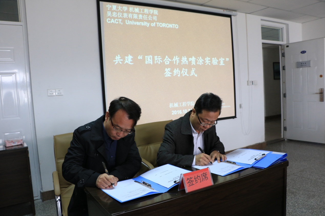 2016年10月24日,williamhill英国与加拿大多伦多大学先进热喷涂中心(CACT)及吴忠仪表有限责任公司举行了共建“国际合作热喷涂实验室”三方合作协议签字仪式。朱学军院长主持签约仪式。