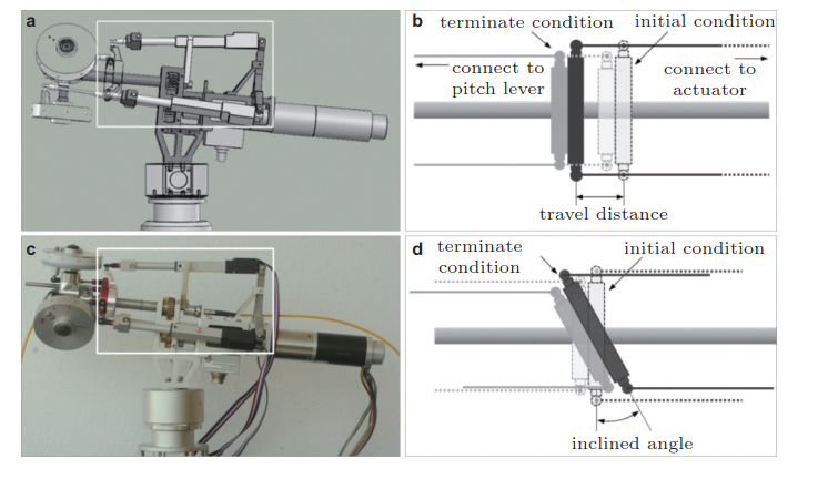 图4 彭志科研究团队开展的浮式风机独立变桨一体化试验研究(a)独立变桨机构模型图,(b)统一变桨原理图,(c)独立变桨机构实物图,(d)独立变桨原理图
