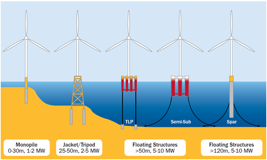 图1 风电设备“由陆向海,由浅入深,由固定式向漂浮式”发展示意图(EWEA 2013)