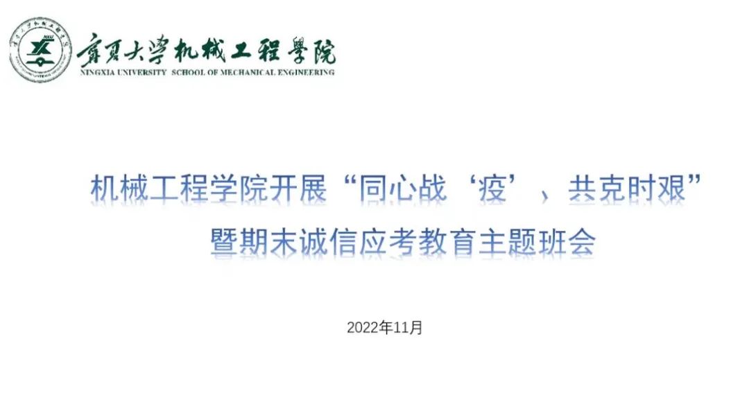 主题班会围绕疫情防控、期末考试考风考纪及诚信教育等内容进行全覆盖,无遗漏的全院学生安全教育。会议结合“银川市集中打好打赢疫情防控歼灭战”的倡议,分析了目前国内疫情防控形势,传达了学校最新的疫情防控要求,进一步强化了学生对当前疫情防控的认识,号召在校同学在当下疫情防控到了最关键时刻、最紧要关头,严格遵守学校的疫情防控相关规定,“再坚持一下”赢得这场战疫的最终胜利。同时希望同学们临近学期末,要集中精力力做好考试复习,认真备考,诚信应考,严格遵守考场纪律,树立考试诚信意识、底线意识,以优异的成绩迎接即将到来的寒假。