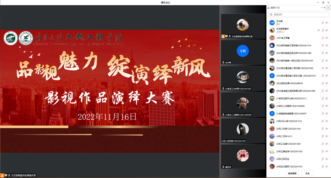 经过文艺部对投稿作品的筛选,最终评选出12组节目作为参赛作品进入本次影视作品演绎大赛。参赛作品有“甄嬛传疫情篇”“让子弹飞”“我不是药神”“征服”等十二篇优秀作品。表演中,同学们语言流畅,吐字清晰,动作恰当,举止大方,表情自然丰富。参赛同学声情并茂、绘声绘色地将12部经典作品复刻还原,或是在原基础上依照现有情况进行修改使之贴合大家的实际生活。内容积极向上,富有正能量,极具创造性与个性,展现了同学们的乐观向上,健康活泼和格调高雅的品质与精神风貌,体现了当代机械学子的整体精神风貌。活动开展期间,观众的热情持续高涨,纵使不能在现场加油助威,但同学们在聊天区的赞扬之词依旧层出不穷。