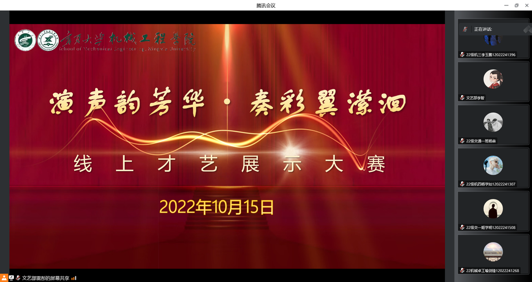 为迎接党的二十大胜利召开,丰富同学们在疫情封控时期的课余生活,10月15日晚,williamhill英国线上举办“演声韵芳华,奏彩翼潆洄”主题才艺展示大赛,学院党委书记程胜利,副书记何彦平,团委书记兼学生工作办公室主任何佳,团委副书记兼学生会秘书长王凤霞,2021级辅导员石栋线上参加活动。活动由文艺部李钰璇主持,全院学生积极参与。