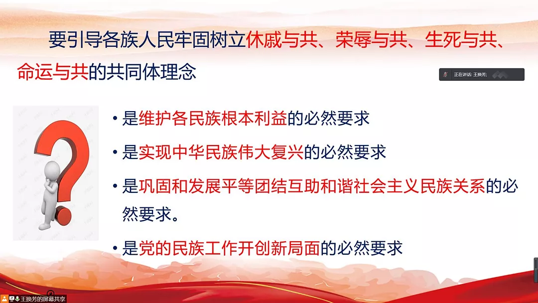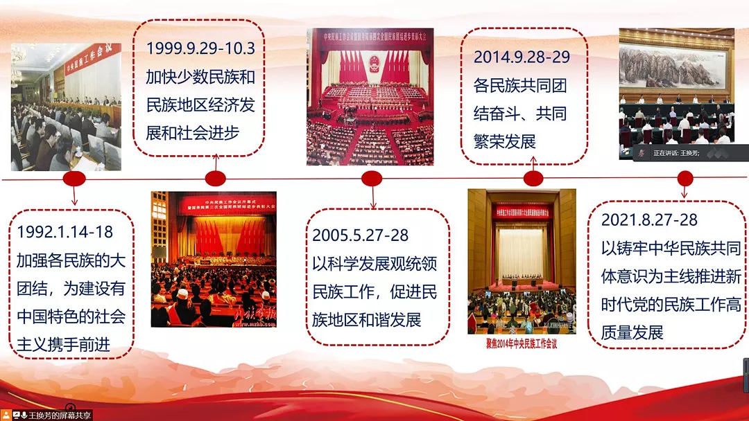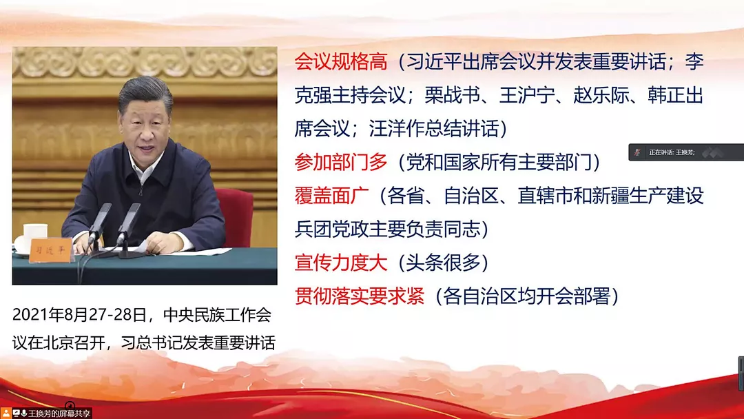 王换芳老师围绕“毛泽东主席的《改造我们的学习》”、“2021年中央民族会议上习近平总书记的重要讲话”,以及“历年来中央民族会议的历史进程和重大影响”三方面展开讲述。她指出,中华民族伟大复兴已经进入关键的一程。面对日益错综复杂的国内国际形势,我们应当尊重客观事实,掌握科学的方法,在民族团结方面走出中华民族独特的道路。
