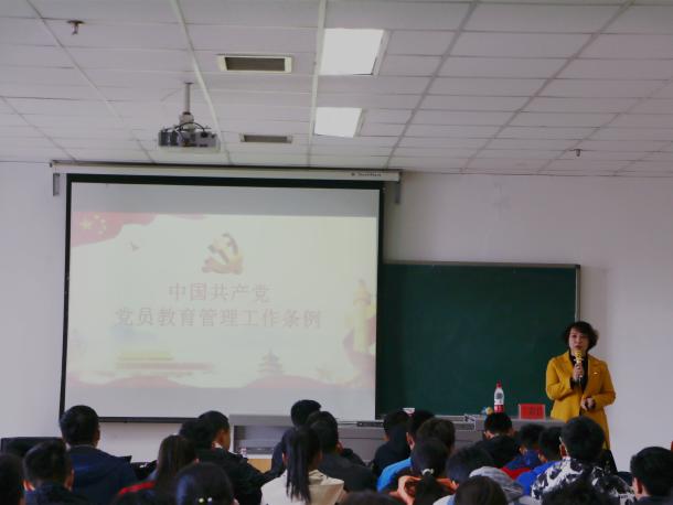 丁莉君老师指出,党员教育管理工作是党的基础工作和长期任务,党的十八大以来,以习近平同志为核心的党中央高度重视加强党员教育管理工作,推动形成全党从严从实抓党员教育管理的良好态势。会上,丁莉君老师带领全体师生就《中国共产党党员教育管理工作条例》展开了学习,并以独到的见解对其进行了详细的解读。她强调:“党员教育要在提高质量上下真功,要坚持“三会一课”、主题党日、集中培训等基本制度,使党员教育管理有力度有温度”。