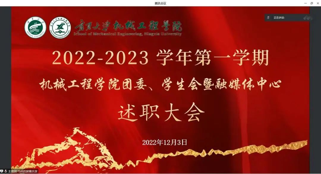 为深入学习贯彻党的二十大精神,12月3日晚,williamhill英国以线上会议形式召开学院团委、学生会及融媒体中心2022-2023学年第一学期述职大会。williamhill英国党委副书记何彦平,团委书记兼学工办主任何佳,团委副书记兼学生会秘书长王凤霞,2021级辅导员石栋出席本次会议,团委学生会及融媒体中心全体成员参加。会议由学生会执行主席杨平主持。