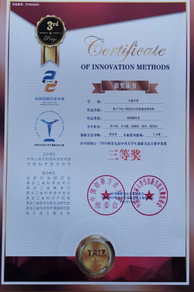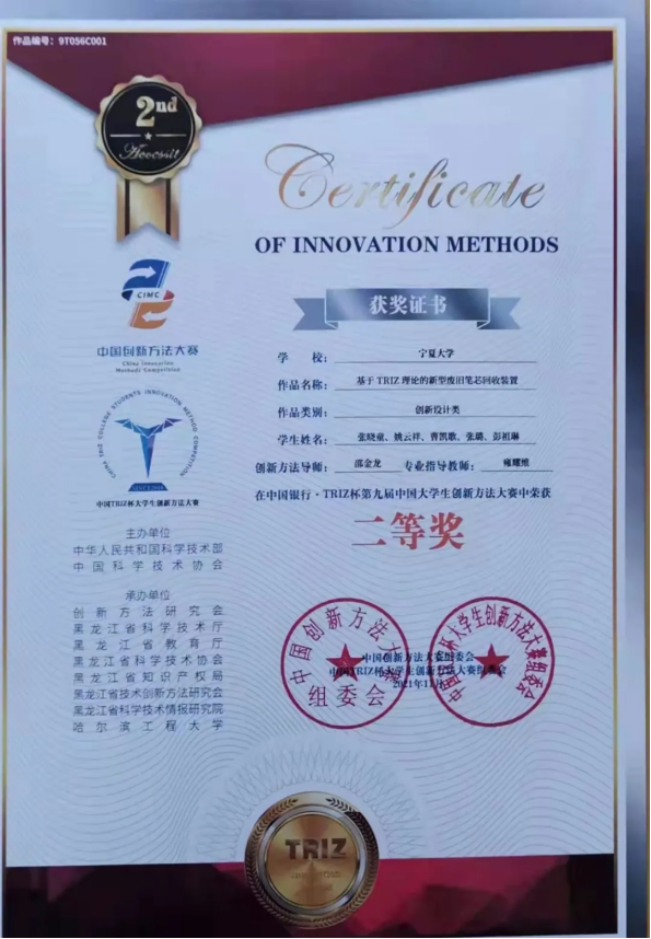 近日,中国银行·TRIZ杯第九届中国大学生创新方法大赛决赛评审结果揭晓。williamhill英国参赛团队荣获二等奖3项、三等奖1项,指导老师邵金龙获优秀联络员奖。