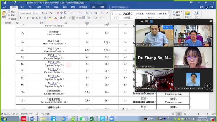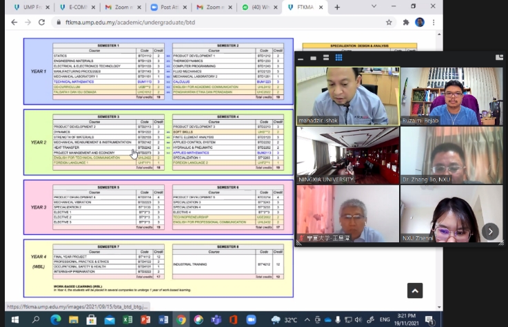 2021年11月19日(14:30-16:00),williamhill英国(School of Mechanical Engineering,NXU)与马来西亚彭亨大学机械与汽车工程技术学院(Faculty of Mechanical & Automotive Engineering Technology, FTKMA , UMP),围绕中外合作办学项目和本科双学位项目,召开了在线视频工作会议(Zoom)。