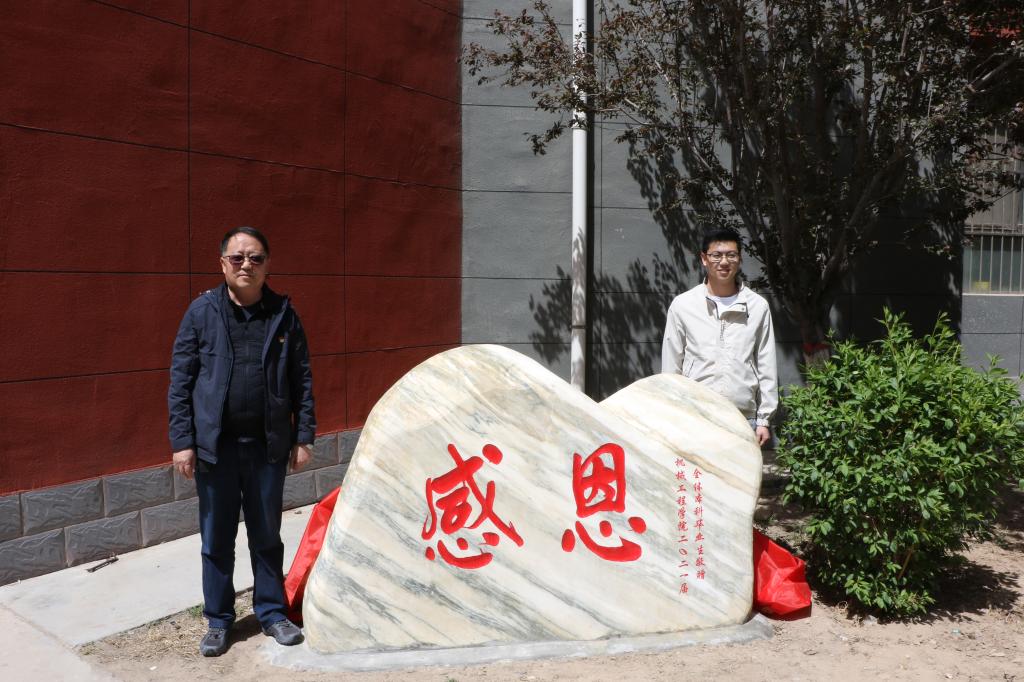钟子杰和2021届毕业生毛宁为“感恩石”揭幕,并由张波为2021届毕业生送祝福。张波讲到,这块“感恩石”不仅是一份礼物,更是2021届毕业生留给学院永恒的回忆。他表示,学院会始终以大家为荣,也希望所有人以学院为家,不断锤炼自身本领,承担起自己的历史使命与社会责任,用实际行动回报母校、回报社会。